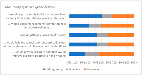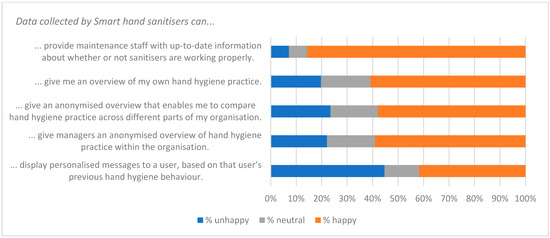 The fear that monitoring would lead to an invasion of privacy probably influenced the 48% of respondents who did not agree that “It is important for employers to have an accurate picture of how well their employees clean their hands” (Figure 3). It almost certainly impacted statements relating to monitoring (Figure 6 and Figure 7). While there was broad acceptance of the idea that data collected by smart sanitisers could “provide maintenance staff with up-to-date information about whether or not sanitisers are working properly” (Figure 6), the use of data to target individuals (even if only to tailor messages) was less popular. However, it should be noted that although opinions clearly varied, responses indicated that there was support for measures that may result in a loss of privacy, and could be considered coercive.