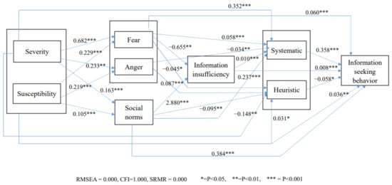 Several additional findings are worth noting: (1) Respondents’ perceived severity exerted a positive effect on the use of a systematic-processing mode (γ = 0.352 ***) but a negative effect on the use of a heuristic-processing mode (γ = −0.148 **). Perceived susceptibility exerted a positive effect on the use of a heuristic-processing mode (γ = 0.031 *) and information-seeking behavior (γ = 0.036 **). Furthermore, both perceived severity (γ = 0.163 ***) and susceptibility (γ = 0.105 ***) exerted a positive effect on ISNs. (2) Fear exerted a positive effect on information-seeking behavior (γ = 0.060 ***). (3) Information insufficiency exerted a significantly positive effect on the use of a systematic-processing mode (γ = 0.010 ***) and information-seeking behavior (γ = 0.008 ***). (4) ISNs exerted a significantly positive effect on information-seeking behavior (γ = 0.384 ***).