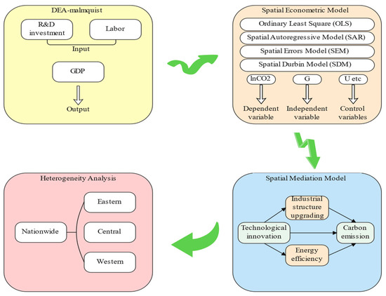 The structure of the study is shown in Figure 1. Firstly, we used a DEA-Malmquist method to calculate the total factor productivity of 30 Chinese provinces as an indicator of technological innovation, where R&D investment and labor force were used as input variables, and GDP was used as a desired output variable. Secondly, the spatial econometric models were applied to analyze the relationship between carbon emissions and technological innovation. In addition, the spatial mediation model was applied to investigate how technological innovation affects carbon emissions using industrial structure upgrades and energy efficiency improvements as mediators. Finally, we test the regional heterogeneity in the eastern, central, and western regions.