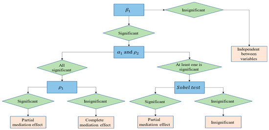 Technological innovation may affect provincial carbon emissions through industrial structure upgrading and energy efficiency improvement. Therefore, a more normative mediation model must be constructed to confirm Hypotheses 2 and 3. In the spatial mediation models, Y refers to the amount of provincial carbon emissions, M refers to industrial structure upgrades and energy efficiency, and X refers to technological innovation. The relevant control variables are kept consistent with the original model, and then the specific mediating effect test models are set in Equations (4)–(6). The test procedure draws on the stepwise mediating effect test proposed by Baron and Kenny [32], and the steps are shown in Figure 2.