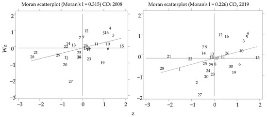 The Global Moran index only reflects the average correlation but not the spatial correlation of individual provinces and cities. In contrast, Moran’s I scatterplot is used to test spatial correlation. For brevity, only data from 2008 and 2019 were selected as samples. The Local Moran’s I (Moran) scatter plot of carbon emissions shown in Figure 3 was drawn using Stata, where the numbers are the carbon emissions performance in each province or city. The first quadrant (top right) and the third quadrant (bottom left) show the interaction between homogeneous provinces. The first quadrant shows the interaction between high-level provinces or cities and other high-level provinces or cities (i.e., high-high level). The third quadrant shows the interaction between low-level and low-level provinces (i.e., low-low levels). The second quadrant (top left) and the fourth quadrant (bottom right) show interactions between heterogeneous provinces. The second quadrant shows the interaction between low-level and high-level provinces (i.e., low-high level). The fourth quadrant shows the interaction between high-level provinces and low-level provinces or cities (i.e., high-low level). Most provinces are located in the first and third quadrants, and their carbon emissions are both spatially heterogeneous and spatially concentrated, showing a strong spatial agglomeration effect.