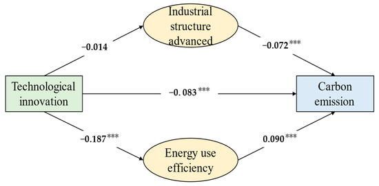 Figure 4 shows the estimated coefficients of the theoretical model. Technological innovation can significantly reduce carbon emissions, and for every 1% increase in technological innovation, the amount of carbon emissions will be reduced by 0.083%. Both industrial structure and energy efficiency play a mediating role. Among them, technological innovation can significantly reduce carbon emissions by improving energy efficiency, while the path of carbon reduction by upgrading industrial structure had not yet been formed.