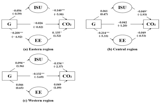 As shown in Table 10, the effect of technological innovation on carbon emissions shows significant spatial heterogeneity. The direct impact of technological innovation on carbon emissions and the indirect effect via industrial structure upgrading is only significant in the western regions (Figure 5c). In the eastern region, the indirect effect of technological innovation on carbon emissions via energy efficiency improvements is significant (Figure 5a). In the central region, technological innovation has little impact on carbon emission, neither directly nor indirectly via industrial structure upgrades nor energy efficiency improvements (Figure 5b).
