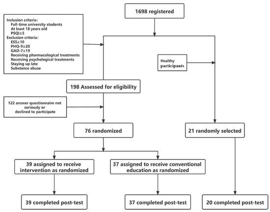 The inclusion criteria were as follows: (1) full-time college student and at least 18 years of age; and (2) Pittsburgh Sleep Quality Index (PSQI) score of 5 or higher, which indicates poor sleep quality [42]. The exclusion criteria were as follows: (1) Epworth Sleepiness Scale score of 10 or higher; (2) 9-item Patient Health Questionnaire score of 20 or higher or a 7-item Generalized Anxiety Disorder scale score of 19 or higher, which implies that insomnia may be caused by depression or anxiety [13,43]; (3) self-reported suicidal ideation with intent; (4) currently undergoing pharmacological/psychological treatments for insomnia; (5) report a diagnosis of any physical/psychiatric disease that causes insomnia (e.g., primary/secondary pain, nervous system damage, schizophrenia, etc.); and (6) substance abuse which may lead to insomnia (e.g., caffeine, nicotine, alcohol, etc.). Ultimately, 198 college students met the experimental criteria. Among these, 122 participants were excluded because they were unwilling to participate in the follow-up, or the time they had taken to answer the questionnaire was too short, indicating that they may not have answered genuinely. Therefore, 76 participants with sleep problems were finally included in the current study. They were randomly divided into two groups: sleep intervention (n = 39) and conventional education (n = 37). We randomly selected 21 participants who had PSQI scores less than 5 [42], as the healthy control group (i.e., the 21 participants did not have any insomnia-related clinical symptoms or possible comorbidities and were considered healthy for the purpose of this study). Figure 1 shows the participant selection flowchart. There were no significant differences in age, sex, or annual household income between the three groups of participants (p ≥ 0.166). The study was approved by the local ethics committee of Shanghai Normal University and all participants signed consent forms at the beginning of the research. The trial was registered at Chinese Clinical Trial Registry before commencement (Registration ID: ChiCTR2100053172). After completion of the post-intervention questionnaires, each participant in the intervention, conventional education, and healthy control groups received 200 yuan, 150 yuan and 60 yuan, respectively, as monetary compensation through WeChat payment.