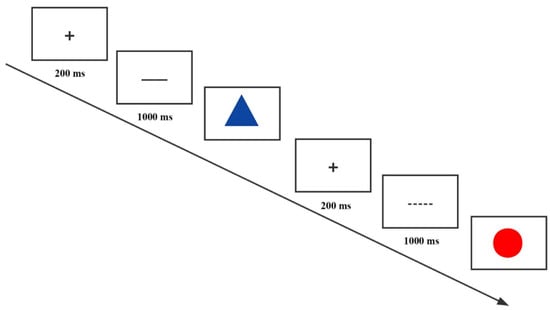 - Cognitive flexibility tasks: At present, the study of cognitive flexibility focuses on two paradigms: deductive and inductive. The main deductive paradigm assessment methods are the Dimensional Change Card Sort, Stroop, Stop-Signal Task, Hand game, Ramp Causality Task, and day and night task. Inductive paradigm methods include the Wisconsin Card Sorting Test, Flexible Induction of Meaning Task, and Flexible Item Selection Task [45]. We used the task switching test to assess the cognitive flexibility of all groups of participants. A testing website was used to present the assessment program on participants’ computers, who were instructed to adjust the resolution. The assessment consisted of cue and target stimuli. There were two kinds of cues—solid lines and dashed lines. The target stimulus contained two dimensions of color (red/blue) and shape (circle/triangle), and the subset of the two dimensions was randomly combined to form four target stimuli: red triangle, red circle, blue triangle, and blue circle. The cue and target stimuli were presented at random. The task required participants to react to the target stimulus (shape/color) based on the cues (solid/dashed lines) such as “react to the shape when the cue is a solid line (press the “F” key for triangles and press the “J” key on the circle)”; “react to the color when the cue is a dashed line (press the “F” key in blue, press the “J” key in red).” If the present cue is the same as the previous cue, it is called a task repetition, and if it is different from the previous cue, it is called a task switch. The tasks appeared at random. In the test, a “+” fixation was presented in the center of the computer screen for a duration of 200 ms, followed by a 1000 ms cue trail and a target stimulus presentation. The target stimulus had no time limit, and the computer automatically recorded participants’ response time and accuracy. The experiment consisted of 20 practice and 120 formal trials, with feedback on whether the practice phase was correct or not in the formal lab phase. The program flow is illustrated in Figure 2. The accuracy rate of the repeat and switch tasks, and the reaction time were used as analysis indicators.