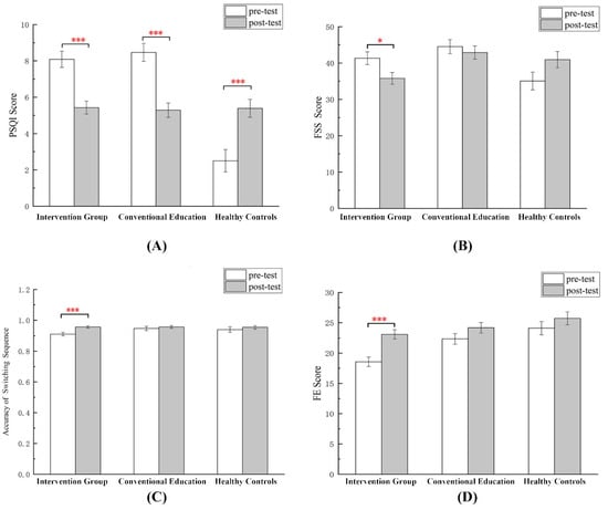 Means with standard error bars for changes in (A) PSQI score; (B) FSS score; (C) switch tasks accuracy; (D) FES score from baseline to follow-up between the intervention, conventional education, and healthy control groups. * p < 0.05; *** p < 0.001.