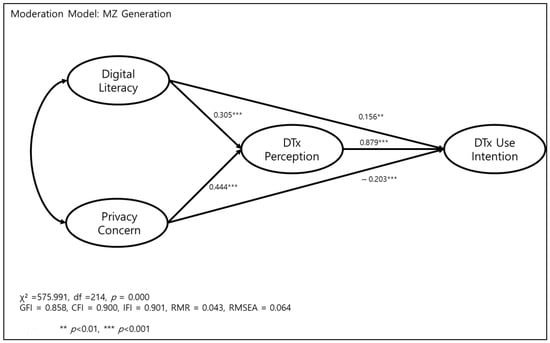 In the main research model, digital literacy did not affect DTx use intention. To compare the MZ generation and baby boomers, a moderation model analysis was performed. We again evaluated the goodness-of-fit indices for the proposed structural equation model for the moderation analysis, and the moderation model generated χ2 = 575.991, df = 214, p = 0.000; and the other fit index indicated a good fit within the accepted exhortation level (CFI = 0.900, IFI = 0.901, RMSEA = 0.064).