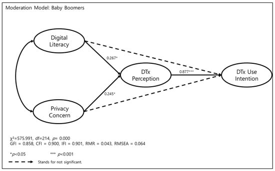 In baby boomers, direct effects of digital literacy and privacy concern to digital therapeutics use intention were not found to be statistically significant. A mediated effect of digital therapeutics perception was found, in that digital literacy mediated digital therapeutics perception (ß = 0.267, p < 0.05) and affected digital therapeutics use intention (ß = 0.877, p < 0.001).