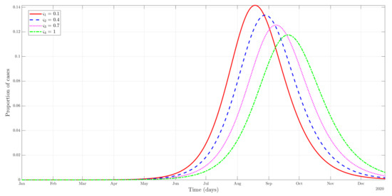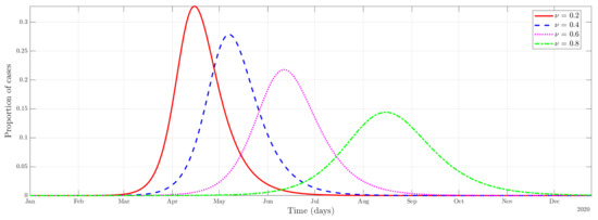 This appendix contains some additional simulations to those presented in the main text. Figure A3 shows then the variation in the proportion of cases (symptomatic and asymptomatic infected) in response to variations in the effectiveness of the lockdown measure, . As can be seen, an increase in efficiency translates into a “flattening” of the curve, reducing the rate at which the number of cases grows by affecting the infection rate.
