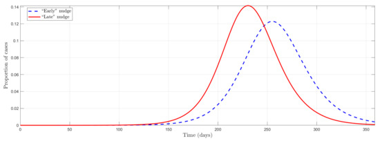 Additionally, it is different to start at an early stage of the pandemic in a country with a culture of preventive measures from another society that promotes this social norm in more advanced pandemic stages. Thus, in the following simulation, we exploit the timing of a policy aimed at shifting social norms in two different periods. We can see in Figure 3 that the model captures well this “timing effect” or anticipation in the public policies. This is of great importance since nudges that directly affect social norms by inducing a change in behavior at the beginning of the pandemic have a more significant effect at “flattening the curve” than when it is at a more advanced stage.