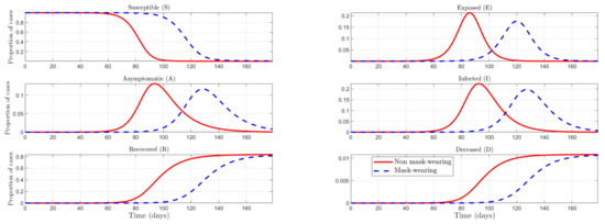 Social influences have been extensively studied as a critical element in their effect on people’s choices and behaviors [23]. In particular, social norms are a significant determinant in the engagement of health-related decision-making, e.g., starting to drink alcohol and smoke cigarettes [70,71,72,73]. In the present model, social norms also influence the actions of individuals since they constitute a decisive factor in the take-up rate for COVID-19 preventive measures. A direct implication of this result is that when designing public policy to increase the number of people using protective measures, policymakers should consider that peers such as work colleagues, friends, and family affect the individual’s behavior. This effect is related to the status quo bias. For example, in the early stages of the pandemic, in those societies where the social norm did not contemplate the use of face masks, individuals were in an equilibrium in which there were insufficient incentives to start protecting themselves. (Spain, for example, is among those countries with a non-mask-wearing culture. In this country, evidence has been found that there is a profile of individuals who are more resistant to mask-wearing: young, educated, unconcerned with being infected, and with an introverted personality. On the other hand, the propensity to use masks is incredibly high among the elderly living in localities where mask-wearing behavior is popular [44].) This status quo was in part affected by social norms. (There is evidence that we can consider wearing a face mask as part of a social norm. For example, in Germany, a recent survey suggests that people who wear face masks in public view others who also wear them more favorably than those who do not [42]. In addition, those who report that their immediate circle, e.g., friends and family, wear masks at a higher rate are more likely to wear them as well [43].) However, as the authorities emphasized its use, behavior moved away from this equilibrium. Indeed, there is evidence that nudges (in the form of persuasive health communication) are effective when appealing to protect others. For example, in this regard, a message that emphasizes how COVID-19 threatens “your community” increases people’s intentions to wear a face mask [41]. About our model, this type of public policy would provoke a strengthening of social norms, which would be reflected in the parameter . As we have seen in Section 4.2.2, changes in the value of this parameter have a significant impact on the dynamics of the pandemic in terms, i.e., of the evolution of cases.