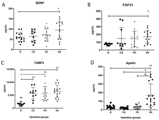 Similarly, plasma levels of BDNF were increased in SG compared to BG (p = 0.015), but BDNF levels were not increased in CG nor in PG (Figure 1A). Furthermore, the plasma levels FABP3 showed a significant increase in CG (p < 0.001), SG (p < 0.001), and PG (p < 0.001) compared to BG (Figure 1C). Post-test measurement of plasma levels of FGF21 showed an increase in all groups compared to BG; however, significant differences were only obtained with the SG (p = 0.016) (Figure 2C).
