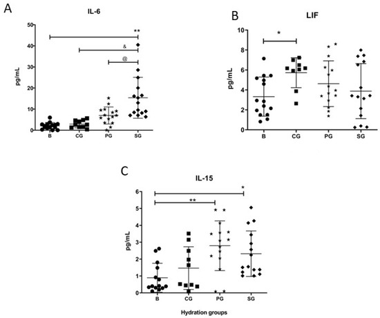 Expression of myokine proteins. (A) The IL-6 levels just increased post-exercise in experimental group (SG). (B) Leukemia Inhibitory Factor (LIF) values increased post-exercise only in the SG. (C) IL-15 values increased in both the placebo group and the post-exercise SG. CG, Control Group; B, Basal; PG, Placebo group. Each participant is represented with a symbol. Data are shown as means ± SD. * p < 0.05 basal vs. post-exercise of each group. ** p < 0.001 basal vs. post-exercise of each group. @ p < 0.05 SG vs. PG. & p < 0.05 SG vs. CG.