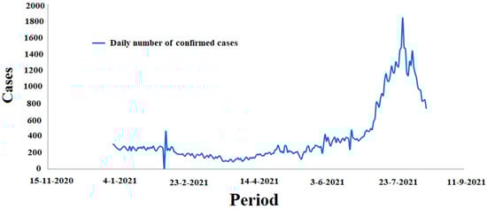 The number of COVD-19 cases in Algeria in the period between 1 January 2021 and 15 August 2021.