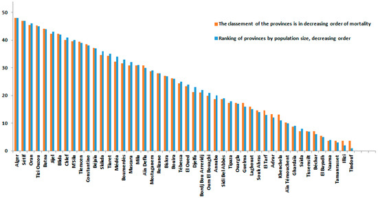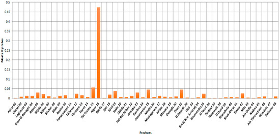 Figure 3, Figure 6 and Figure 7 provided a more accurate and detailed view of the level of mortality risks by province. The provinces of Batna and Tizi Ouzou showed higher risks, and this means that besides the population density component already demonstrated [20], there are other factors related to the distribution of the number of deaths in the country [10]. The three provinces with the largest population density (Algerirs, Oran, and Constantine) were at the forefront of the ranking with the provinces of Tizi Ouzou, Setif, and Batna.
