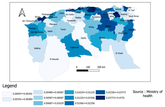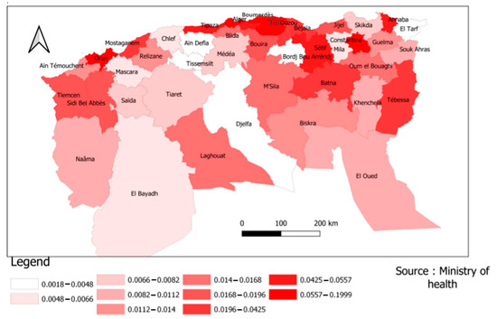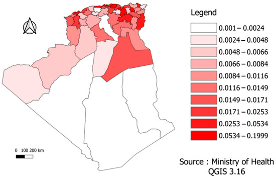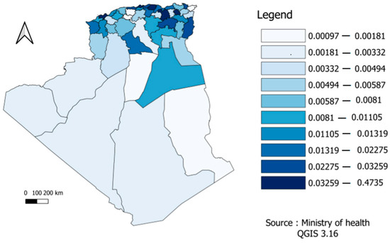 In the figure below, the mortality risk was divided according to the different provinces into ten sections or levels in order to facilitate reading and clarify the content. According to Figure 4, we found differences across the Algerian regions. For example, the northeast, where most of the population is concentrated, was the region that suffered the most deaths.