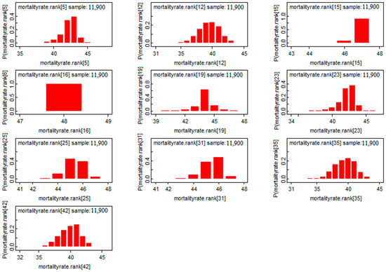 According to Figure 8, we found a Gaussian shape for the mortality rate estimators for the first eight provinces. This exhibits a good sign of convergence for this model. Moreover, marginalization allows Bayesian analysis to eliminate nuisance parameters, in another way, it reduces the dimension of the parameter “space” to be estimated. Based on this characteristic, we found marginal distributions in Figure 8. Through these distributions, the posterior mass is provided and the comparison between the risks will be easier. In Figure 8, we saw that all the a posteriori values are located to the right of the value “0”, which means that the risk of mortality is significant in the provinces represented.