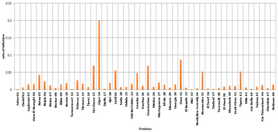In the above figure, the infection risk was divided according to the different provinces into ten sections or levels in order to facilitate reading and clarify the content. Figure 11 showed the distinction across the Algerian regions. The northeast, where the population is concentrated, was the most affected region by COVID-19 and had the highest infection rate. The province of Ouargla in southern Algeria also showed a high infection rate, which may result from economic activity (specifically related to oil and gas, as they are the main products of this province). The economy may be the most important explanatory factor of this finding.