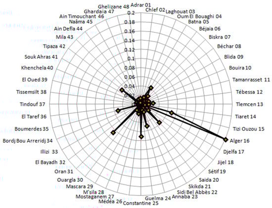 Figure 9 and Figure 10 showed the rates of infection in different provinces. In particular, the radar chart in Figure 10 provides an illustrative data for the spread of the virus within the scope of the country, or even a group of countries in some cases. It is evident that the majority of the provinces were concentrated within a band, which means that the dispersion is low in most of the provinces with regard to infection, which is more prominent in the provinces of Algiers, Annaba, Tizi Ouzou, Setif, Constantine, Oran, Tipaza, Boumerdes, and Batna. Figure 9 and Figure 10 also showed that Algiers Province had a very high peak infection rate, indicating that the risk of COVID-19 infection in this province between 1 January 2021 and 15 August 2021 is higher than the risk in the other provinces (Tizi Ouzou, Sétif, Constantine, and Oran provinces).