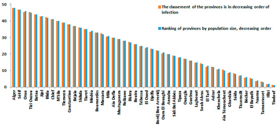 Figure 13 and Figure 14 provided a more accurate view of the risk of infection by province. The provinces of Tizi-Ouzou, Boumerdes, Annaba, Tipaza, and Tébessa showed higher risks in relation to their population size, which means that the rate of infection between provinces is based on several explanatory variables beyond the size of the population, economic activity, and even distance from the borders.
