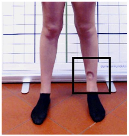 Post-surgical scarring at the left anterior tibia after melanoma resection (black squared frame).