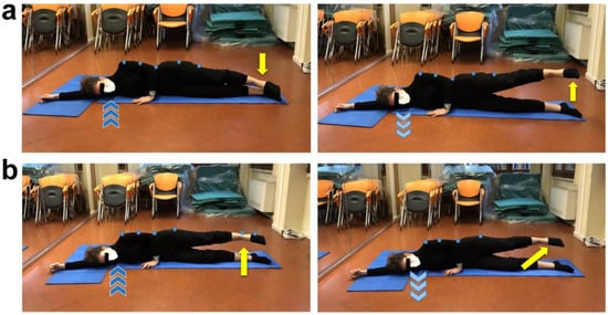 Glutes, abductors, and adductors strengthening exercises in lateral decubitus position. (a) Whole body straight in lateral decubitus position (light blue dots) and dorsiflexed feet together (pointing down yellow arrow), keep floor arm straight upward and rest head on it, bend top arm and place hand on the floor in front of the abdomen. Inhale (dark blue arrows) then exhale (light blue arrows) while abducting the top extended lower limb (pointing up yellow arrow). Inhale and get back to starting position. Three sets of 45 s for each lower limb, 30 s of recovery. (b) Repeat the previously described exercise adding an abducted lower limb extension on sagittal plane (diagonal yellow arrow), keeping lumbar spine in neutral position. Three sets of 45 s for each lower limb, 30 s of recovery.
