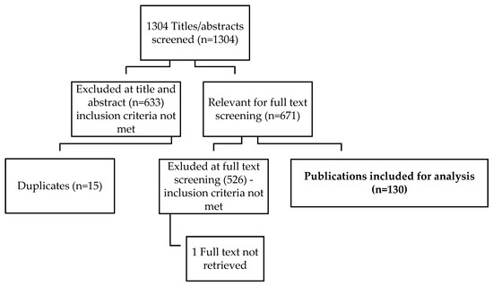 As summarized in Figure 1, the preliminary search generated 1304 citations, with 671 citations meeting the criteria for review. McFadden undertook full-text reviews on 671 publications resulting in 130 publications that met all inclusion criteria.