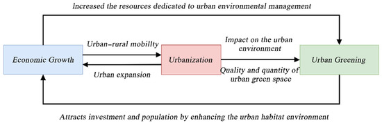 Relationships between economic growth, urbanization, and urban greening.