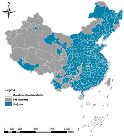 China’s unprecedented urbanization has made it an integrated system with complex urban–human–environment interactions, which makes it a perfect target for cross-system sustainability assessments [61,66]. Therefore, in this paper, we assess the coupled and coordinated relationships between urban economic growth and urban greening, taking China as an example. Specifically, the period 2005–2019 was chosen for this study. During this period, China began to shift from a one-sided pursuit of high economic growth to a comprehensive promotion of sustainable development [67]. After excluding cities with unavailable data, we collected a total of 286 cities in China for the study, including four central municipalities, 15 sub-provincial cities, and 267 prefecture-level cities. Hong Kong, Macau, Taiwan and cities in remote western regions were not considered, as shown in Figure 2.