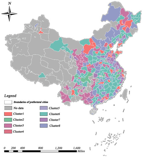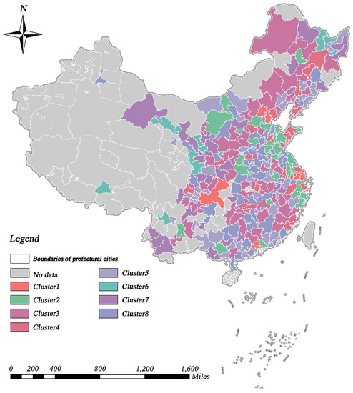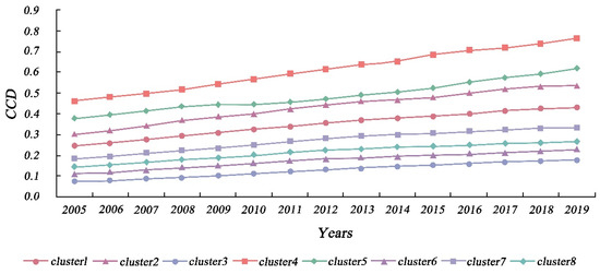 Through TSC analysis, we investigated the spatial and temporal distribution characteristics of the CCD values. Specifically, according to the method mentioned in Section 3.3.1, we evaluated the range of values for the number of clusters (K) and computed the associated SSE values, which were generally low and consistent when K = 8. Therefore, the research region was separated into eight time-series clusters, as shown in Figure 7 and Figure 8. As shown in Figure 9 and Table 2, we first investigated the temporal and spatial evolution patterns of the eight clusters, as well as more specific characteristics of the clusters, such as the number of cities in each cluster, the spatial dispersion pattern, the phase of coupling coordination, and the linear fit of CCD changes. Overall, the regional CCD distribution demonstrated heterogeneity, with the CCD values of eastern coastal cities and inland central cities being much greater than those of other cities, reflecting the more coordinated and balanced growth of the aforementioned cities. Eastern coastal cities and inland central cities show better economic development and have more available funds for environmental protection [6], and citizens are more concerned and involved in local environmental improvement [74]. As a result, these cities are able to ensure economic growth while actively improving urban greening, thus allowing for balanced development of the two systems. It was found that the CCD values of all clusters showed an increasing trend, indicating that the coupling of economic development and urban greening in all cities has become more coordinated over time; however, but the heterogeneity among clusters was still obvious. The highest CCD was that of cluster 4, which has risen from the basic coordination stage in 2005 to the coordination stage in 2019, followed by those of clusters 1, 2, and 5, all rising from a low-level coordination stage in 2005 to a basic coordination stage in 2019. Although the CCD of cluster 3 was also increasing, it was still in the uncoordinated development stage. Clusters 6–8, on the other hand, progressed from the initial uncoordinated stage to the low-level coordinated stage.