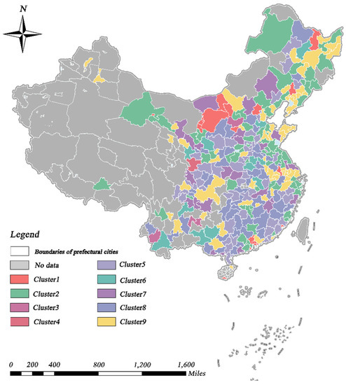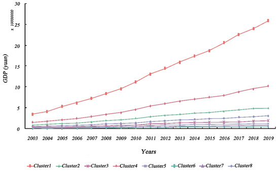 Based on the TSC results, we analyzed the spatio-temporal patterns of urban economy and urban greening. Specifically, urban economy and urban greening were classified into eight and nine different geographic time-series clusters, respectively, in accordance with the analytical approach described in Section 3.3.1. In terms of GDP, the eight clusters presented substantial regional variability. Likewise, the calculation of annual means for all cities in each cluster, in order to describe the temporal trends, presented significant differences between clusters, as shown in Figure 3 and Figure 4. Cities in eastern coastal regions tended to have larger economic aggregates and more pronounced growth trends than other cities. The key causes for this unequal spatial growth were that the cities described above acted as pioneers, in terms of opening their markets to foreign investors and adopting a free economy after the reform and opening [72]. In addition, hinterland cities, such as Chongqing (municipalities), Wuhan (sub-provincial cities), and Xi’an (regional center cities), which possess a higher urban hierarchy, experienced equally pronounced economic growth, which is partly attributable to the effect of national policies.
