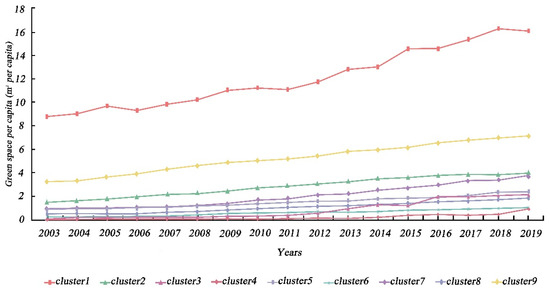 As illustrated in Figure 5 and Figure 6, the regional distribution and temporal trends of UPGS clusters presented comparable dynamic features to the GDP clusters. Overall, all cities showed an upward trend in UPGSs, indicating that the public green space per capita was increasing in all cities. In terms of geographic scope, larger annual average UPGSs tended to occur in cities in northern China, as well as in cities along the southeast coast (e.g., Shenyang and its surrounding cities), and some cities in the Shandong Peninsula, Yangtze River Delta, and Pearl River Delta cities consistent with prior research findings [59,73]. In terms of horizon, cluster 1 had the fastest increase in the value of public green space per capita and growth rate, almost doubling 8.7 m2/person in 2003 to 16.2 m2/person in 2019. Clusters 2, 7, and 9 also presented a more pronounced trend, while the UPGS of the other clusters, although also increasing, do not change significantly over time. In particular, despite the massive influx of immigrant population, Beijing’s public green space per capita rose from 7.48 m2/person in 2005 to 16.32 m2/person in 2019, further highlighting the central government’s relentless efforts to pursue sustainable regional development and create high-quality living ecological spaces. Similar results were observed in Dongguan, Guangzhou, Jiayuguan, Yinchuan, Zhuhai, and Shizuishan.