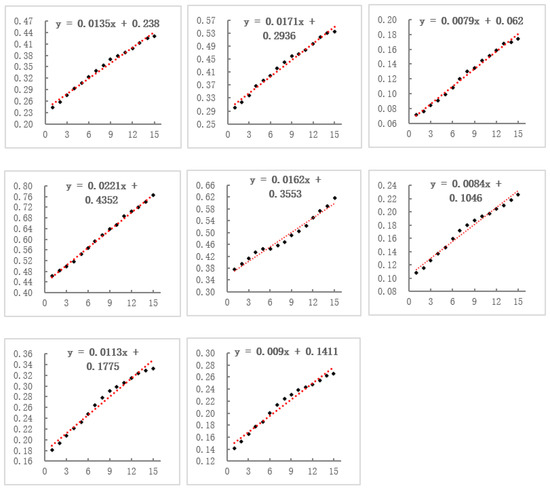 Linear fitting results for CCD values in the eight clusters.