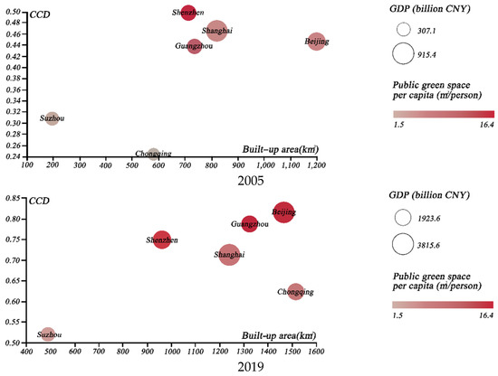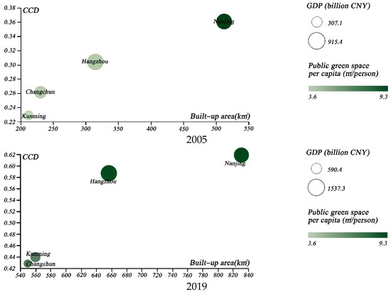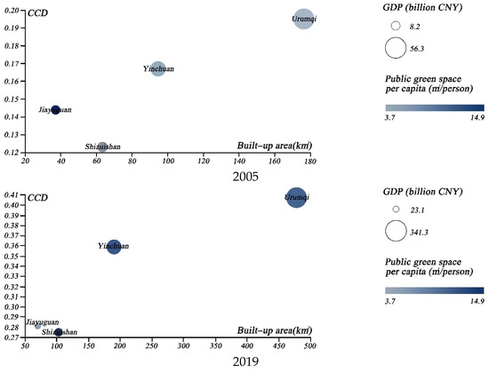 We then chose several specific groups of cities, in order to illustrate the coupled development of urban greening and the urban economy. First, we selected the cities with the highest GDP levels; namely, Beijing, Shanghai, Guangzhou, Shenzhen, Chongqing, and Suzhou. The temporal evolution of the above cities from 2005 to 2019 was compared through the use of scatter plots (Figure 10), in terms of CCD, GDP, public green space per capita, and total built-up area. The results indicated that Beijing surpassed Shenzhen as the most coordinated city. Even with the second largest built-up area of the city, it achieved a significant coordination boost, which can be largely attributed to urban greening management [13]. Secondly, we further analyzed the coupled coordination of the four major Chinese garden cities; namely, Nanjing, Changchun, Hangzhou, and Kunming (Figure 11). Our findings suggest that Nanjing has the best coupling coordination, although the gap between Nanjing and Hangzhou is reducing. Finally, we considered the CCD of four central and western cities with high per capita public green space; namely, Urumqi, Yinchuan, Jiayuguan and Shizuishan (Figure 12). The results indicated that the coupled coordination results for all of these cities were steadily increasing. Except for Urumqi, the other cities were still in the early stages of coordination, and the slow expansion of their urban economies affected the coupled and coordinated development of the two systems. As a result, future policy formulation must take city-specific features.