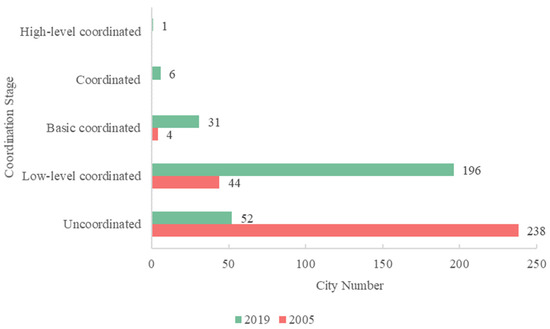 Number of cities in different stages of coupling coordination in 2005 and 2019.