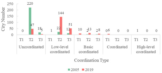 Number of cities in coupling coordination stages T1, T2, and T3 in 2005 and 2019.