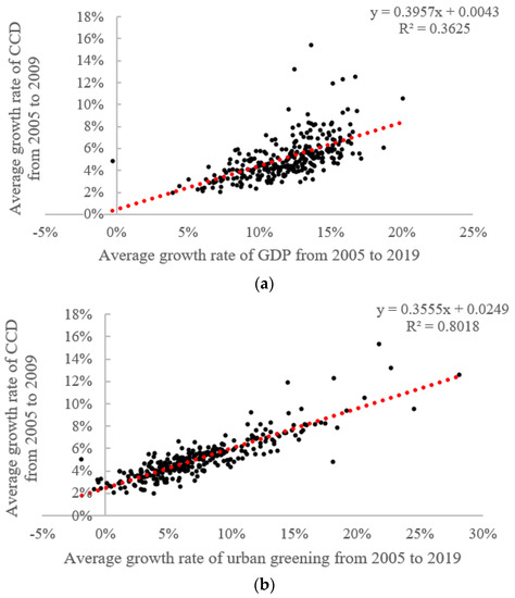 Scatterplot and fitting results of the relationship between the change rate of GDP and CCD (a), the change rate of urban greening and CCD (b).
