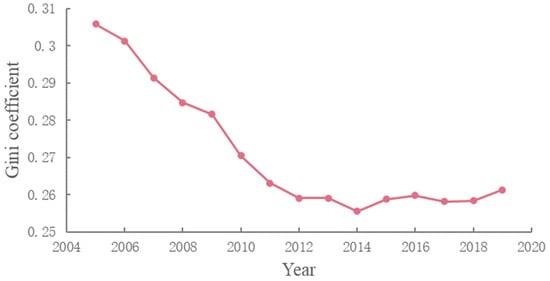 From 2005 to 2019, the computed Gini coefficient indicated the progression of CCD regional inequality in all cities. This finding is in line with that shown in Figure 16. The evolution of the Gini coefficient for CCD fluctuated between 0.26 and 0.3, with a mean value of 0.271. This finding is not difficult to understand, as the regional inequality of economic development [45,75] and urban greening [34,37,38,48] in China has been widely verified. In terms of temporal evolution, the Gini coefficient presented an overall decreasing trend, indicating improvement in the gap between regions, in terms of the coordinated development status in both economic growth and urban greening.