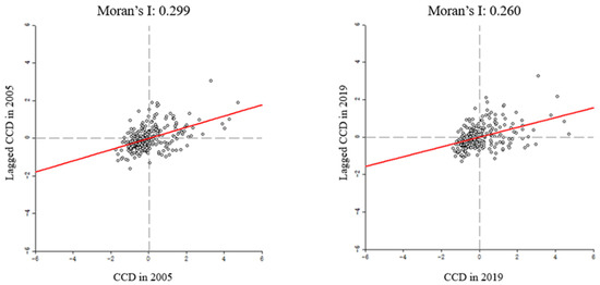 Global Moran’s I scatterplots for CCD in 2005 (left) and 2019 (right).