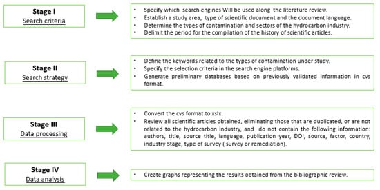 In this stage, the selection criteria are fundamental to ensure good research. The information with which the study will be developed is based on scientific articles obtained from reliable sources from the search engines, Scopus and Web of Science, from which the bibliographic review of the types of contamination is projected: water, atmospheric, and acoustic, in the period of time from the 1970s, due to the first world oil crisis caused by the internal struggle in the Organization of the Petroleum Exporting Countries (OPEC), to 2021 []. The accepted languages of the scientific articles published throughout the American continent are Spanish, English and Portuguese.