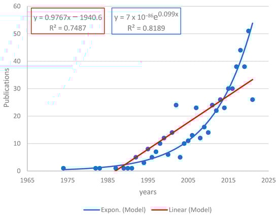 Figure 3 shows the production of scientific articles in the period 1970–2022, with a total of 557 articles extracted from the virtual platforms Scopus and Web of Science. An exponential growth can be noticed in the year 2005, which is based on the transience index, which allows for the evaluation of the production of authors that have only published a single work on a specific topic []; moreover, Price’s Law of exponential growth states that science grows at a compound interest rate, multiplied by a given amount in equal periods of time []. Therefore, two models were established: a linear model (y = 0.9767x − 1940.69) and an exponential model (y = 7 × 10−86e0.099x). The coefficient of determination (R2) shows a higher value in the exponential model (R2 = 0.8189) than in the linear model (R2 = 0.7487).