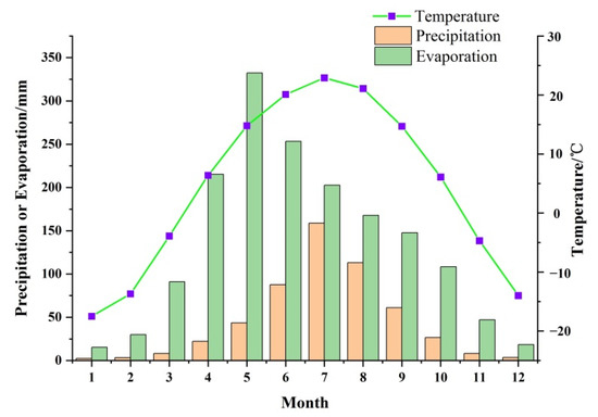 According to the Köppen climate classification, the study area lies in the temperate climate zone and belongs to the hot summer–dry winter temperate climate class (Dwa) with the temperature of the hottest month being over 22 °C. The annual average temperature, precipitation and evaporation from 1962 to 2000 were 4.3 °C, 538.6 mm and 1629 mm, respectively. Based on Figure 2, rainfall is mainly concentrated in the summer stage (from June to September), which accounts for approximately 78% of total annual rainfall, while evaporation mainly occurs from April to September, a period that accounts for around 80% of total annual evaporation.