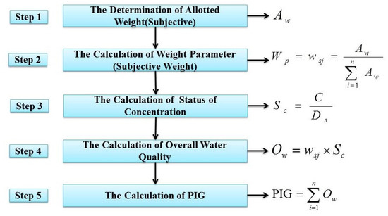 As is shown in Table 2, a total of twelve chemical parameters (TDS, TH, Ca2+, Mg2+, Na+, K+, HCO3−, Cl−, SO42−, NO3−, F−, Fe3+) were chosen to carry out drinking-water quality appraisal in the study area. The procedures for computing the traditional PIG are summarized briefly in Figure 3 [15]. In Step 1, the allotted weight () (numbers from 1 to 5) was assigned by taking their respective importance for human health into consideration. The number itself quantitatively indicated the extent of impact on human health, so the larger the number was, the greater the impact it had. Step 2 calculated the subjective weight () using the ratio of the allotted weight () of each parameter to the sum of all values. The ratio of the measured concentration (C) to the drinking-water standard () of its corresponding index was the result of the status of concentration (). Overall water quality () for drinking purposes was gained via the multiplication of the subjective weight () and the status of concentration () in Step 4. Then, in Step 5, after calculating the sum of for each water sample, their respective PIG was obtained.
