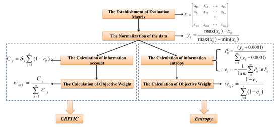 Technical roadmap of objective weight determination using the CRITIC and Entropy methods, respectively.