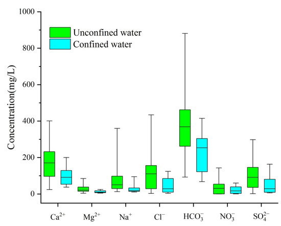 Box diagram of 7 main ion concentrations in confined water and unconfined water.