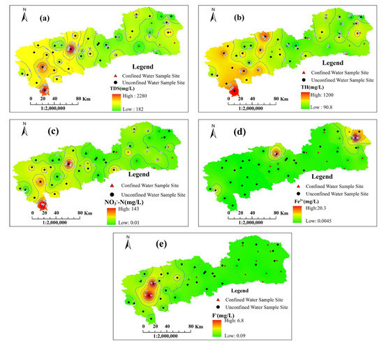 Spatial distribution of five indexes of groundwater in the study area: (a) TDS; (b) TH; (c) NO3−-N; (d) Fe3+; (e) F−.