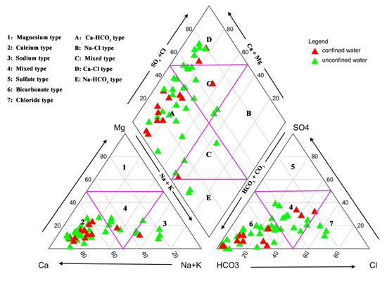 Proposed by Piper [42], the Piper diagram is a commonly used tool to show the main hydrochemical types of a large number of groundwater samples from a specific area. As is shown in Figure 8, three major cation and anion types as well as a mixed type (non-dominant type) are listed as 1–7 in the bottom two triangles. Five categories of hydrochemical types are labeled A–E in the middle diamond. The bottom-left triangle indicates that the dominant cation in the vast majority of samples was Ca2+, and in the minority of samples, this was Na+ or a mixed type (non-dominant cations). The bottom-right triangle indicates that the dominant anion in the vast majority of samples was HCO3−, while some had no dominant anions (mixed type), and three water samples abounded in Cl−. Based on the diamond in the middle, the hydrochemical type of groundwater in the study area was relatively diverse as a whole, with the dominance of the HCO3-Ca type, as well as some Cl-Ca type, mixed type and a few HCO3-Na type.