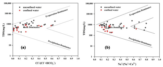 Gibbs diagrams were initially proposed by Gibbs [43] to study the hydrochemical evolution characteristics of surface water, and their usage is extended to the field of groundwater studies nowadays [44,45,46]. Though this widely used and mainstream method remains controversial in the interpretation of groundwater chemistry [47], it roughly provides the overall tendency of the evolution of groundwater chemistry when combined with the Piper diagram, as in this study. Based on the relationships between TDS and Na+/(Na+ + Ca2+), and TDS and Cl−/(Cl− + HCO3−), respectively, three genres of mechanisms affecting the chemical composition of natural water could be determined: precipitation dominance, rock (lithology) dominance and evaporation dominance [43]. According to Figure 9, a great quantity of groundwater samples were in the “rock dominance” section, indicating that water–rock interaction (rock weathering and leaching) was the major factor controlling the chemical types of groundwater. In addition, a small amount of unconfined water samples had a tendency towards evaporation dominance with the characteristics of high Cl− and TDS levels. This is mainly caused by the arid and semi-arid climate with little precipitation and relatively intensive evaporation effects.