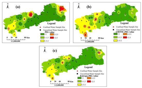 Distribution maps of PIG values, CRITIC-PIG values and Entropy-PIG values in the study area: (a) PIG values; (b) CRITIC-PIG values; (c) Entropy-PIG values.