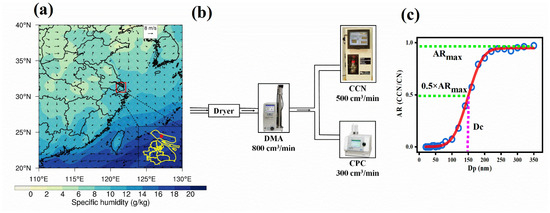 (a) The averaged 850 hPa wind field and 10 m specific humidity from 0:00 to 7:00 (LT) on 2 November 2019. The red dot at the bottom right is the field experimental site. (b) The instrumental set-up. (c) Measured (circle) and fitted size-resolved particle activation ratio curves.